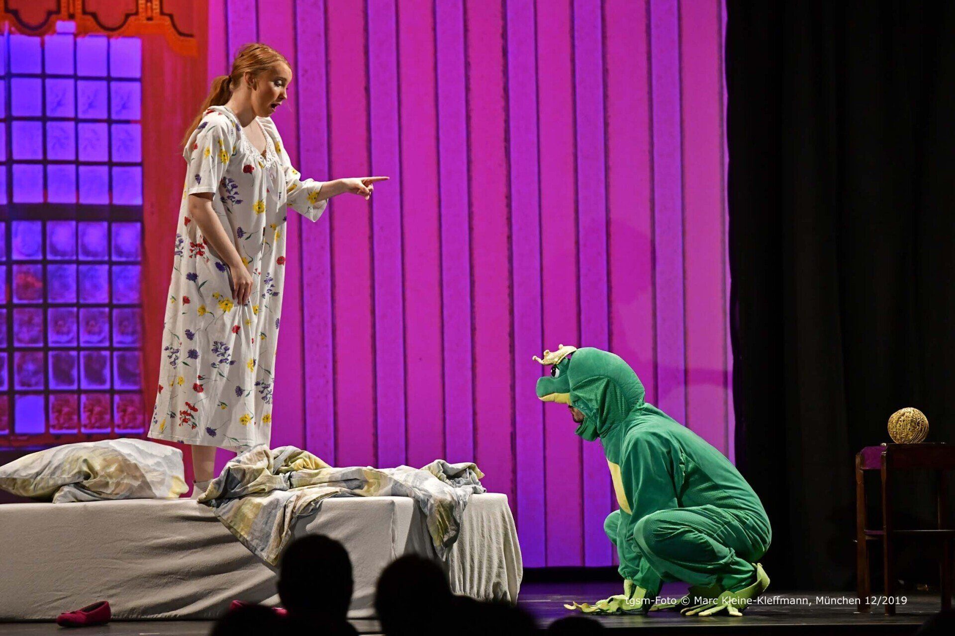 Einer Prinzessin fällt beim Spielen ihre goldene Kugel in den Schlossbrunnen. Ein sprechender Frosch bietet ihr an, den Ball aus dem Brunnen zu holen. Er hat aber vier Bedingungen: Er will an ihrem Tisch sitzen, aus ihrem Becher trinken, von ihrem Teller essen und in ihrem Bett schlafen. In ihrer Not willigt die Prinzessin ein. Kaum hat sie die goldene Kugel wieder, läuft sie davon und will ihr Versprechen nicht einlösen. Darauf kommt der Frosch an die Tür des Schlosses und fordert ein, was die Prinzessin ihm versprochen hat …